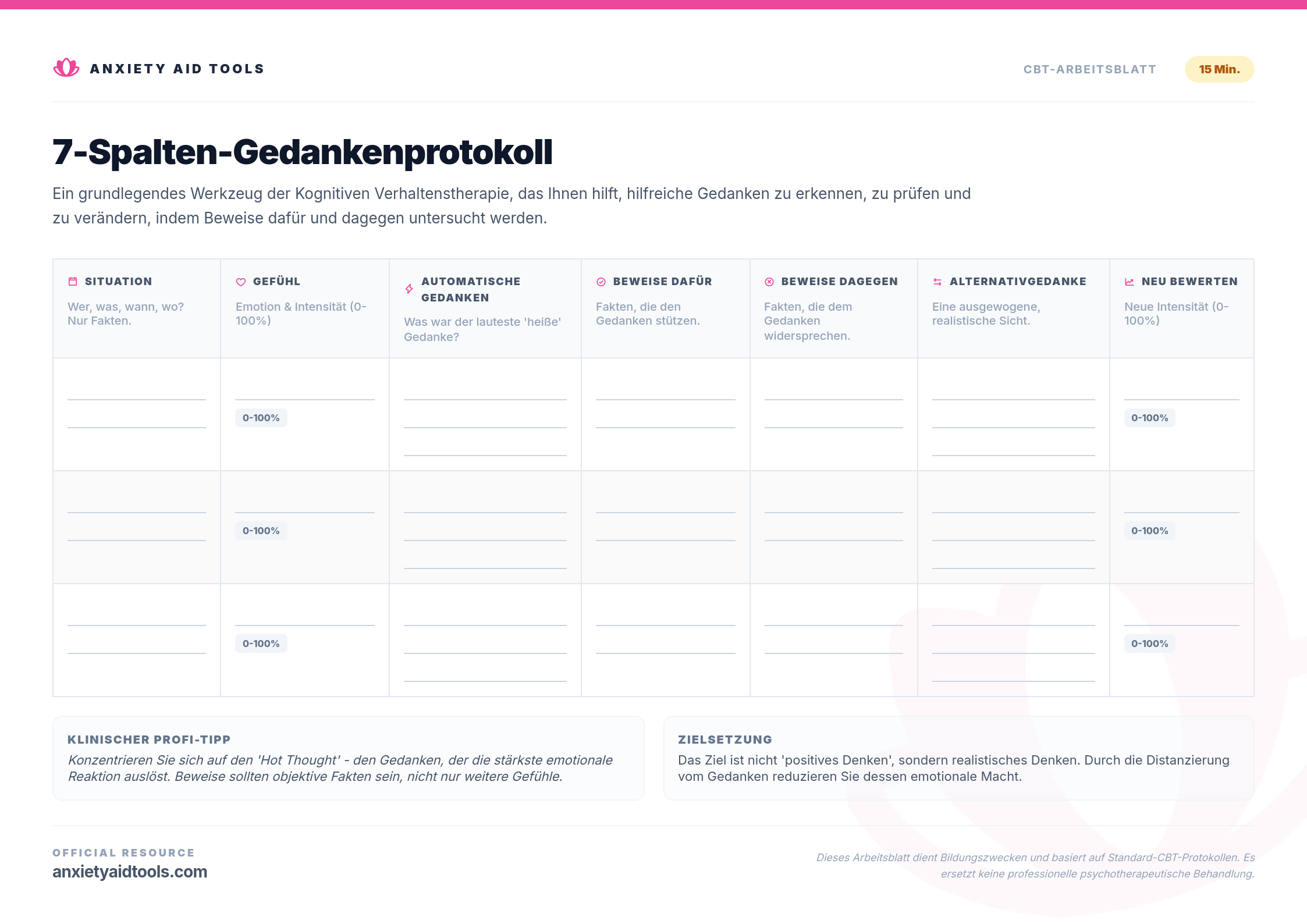 Das 7-Spalten-Gedankenprotokoll ist der Goldstandard der Kognitiven Verhaltenstherapie (CBT). Es ist eine strukturierte Methode, um Gedanken zu bewerten, die emotionalen Stress auslösen. Indem Sie langsamer werden und die Beweise für und gegen einen Gedanken aufschreiben, können Sie von emotionaler Beweisführung zur objektiven Realität übergehen.