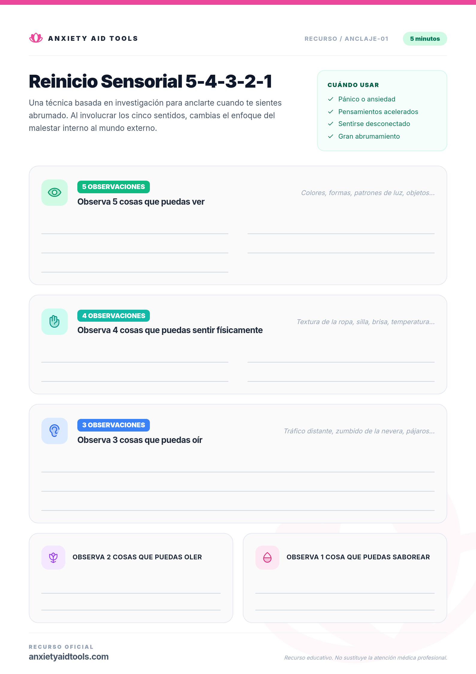 Nuestra hoja de trabajo de Arraigo 5-4-3-2-1 incluye psicoeducación sobre cómo la conciencia sensorial interrumpe la respuesta al estrés del cuerpo y una sección dedicada para la práctica. La parte para completar está diseñada para ser utilizada varias veces, lo que le permite abordar diversas instancias en las que se siente abrumado.