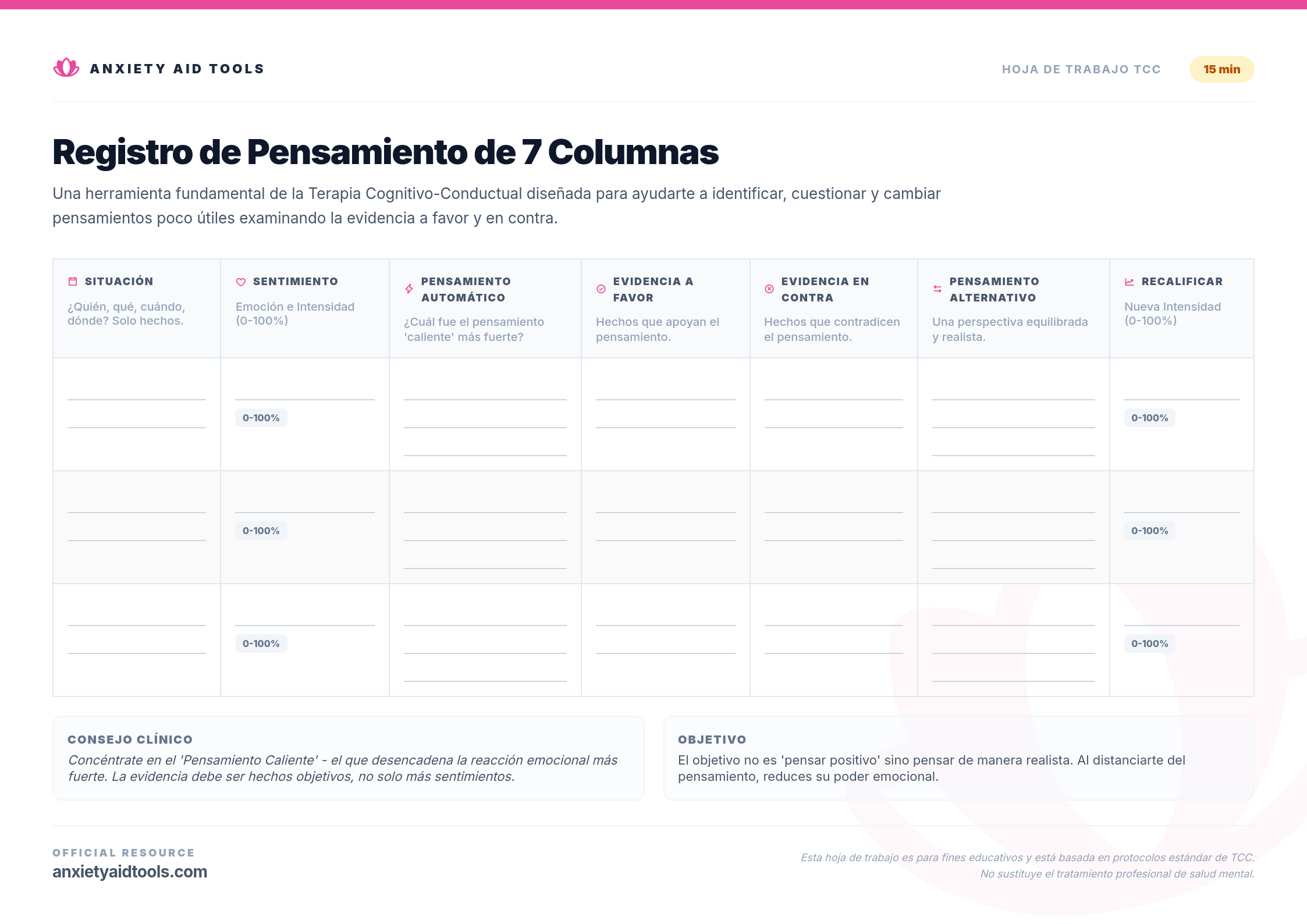 El Registro de Pensamiento de 7 Columnas es el estándar de oro de la Terapia Cognitivo-Conductual (TCC). Es una forma estructurada de evaluar los pensamientos que desencadenan malestar emocional. Al disminuir la velocidad y escribir la evidencia a favor y en contra de un pensamiento, puedes pasar del razonamiento emocional a la realidad objetiva.