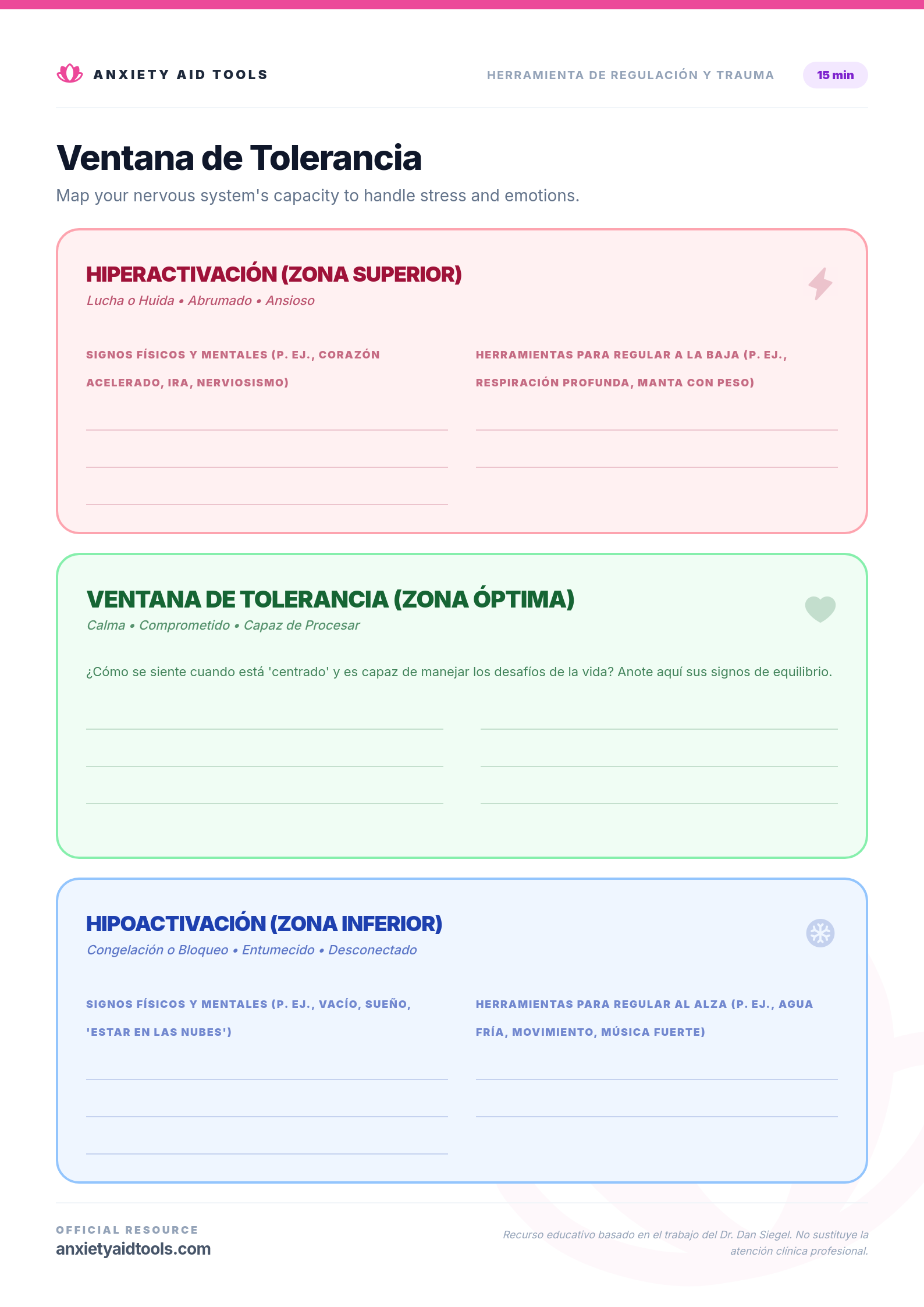 Al identificar sus desencadenantes y síntomas personales, puede detectar la desregulación a tiempo. Nuestra hoja de trabajo de la Ventana de Tolerancia ofrece un espacio dedicado para enumerar las herramientas específicas que le ayudan a regresar a su centro, ya sea que necesite "regular a la baja" la ansiedad o "regular al alza" el entumecimiento.