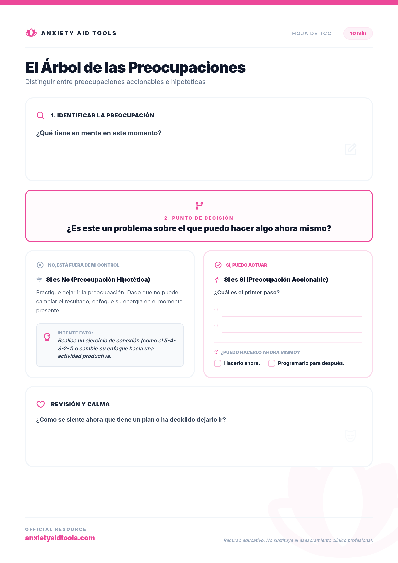 Usar el Árbol de las Preocupaciones de manera constante ayuda a reentrenar su cerebro para priorizar la resolución efectiva de problemas sobre la preocupación 'pasiva'. Es particularmente eficaz para el Trastorno de Ansiedad Generalizada (TAG) y para cualquier persona que se sienta abrumada por una larga lista de inquietudes.