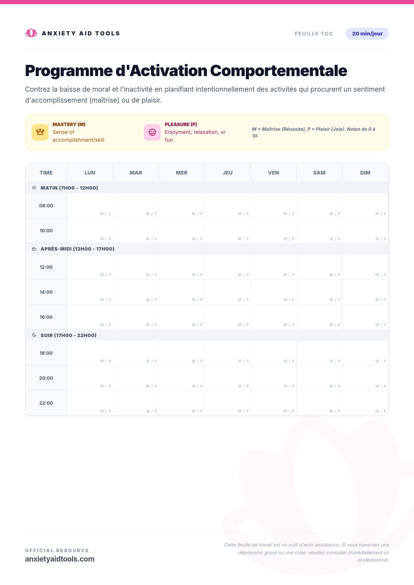 En planifiant ces moments à l'avance et en évaluant ensuite vos niveaux d'accomplissement et de plaisir, vous pouvez identifier les activités qui ont le plus grand impact sur votre humeur. Cette feuille de travail propose une grille hebdomadaire divisée en blocs (matin, après-midi et soir) pour vous aider à construire une routine plus équilibrée et épanouissante.