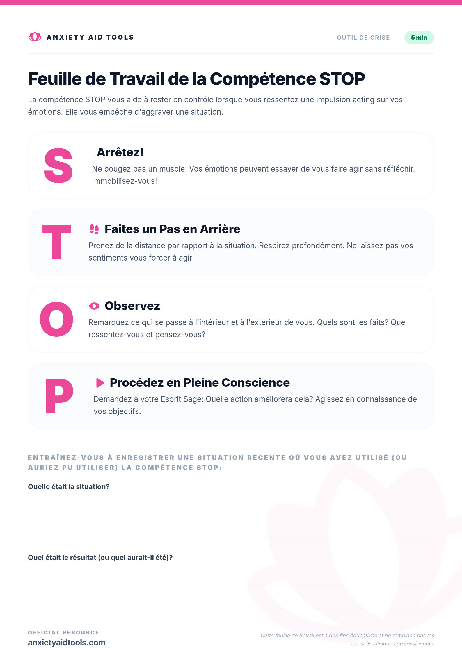 La compétence STOP est un outil fondamental de tolérance à la détresse conçu pour créer un 'espace' entre un déclencheur et votre réaction. Dans les moments de haute émotion, notre instinct naturel est de réagir immédiatement, souvent de façons qui aggravent la situation (par exemple, envoyer un texto méchant, démissionner d'un travail ou se retirer).