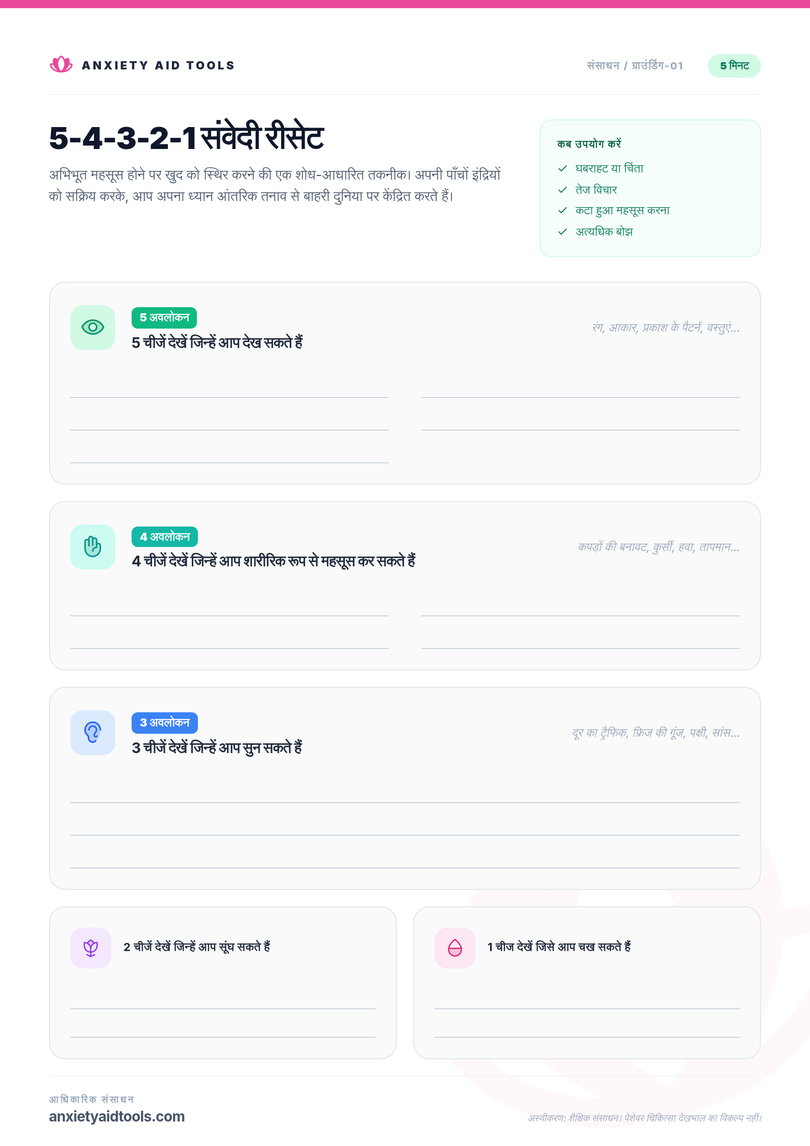 उलटी गिनती संरचना (5-4-3-2-1) संज्ञानात्मक मचान प्रदान करती है जो आपके मन को एक ठोस कार्य देती है, इसे चिंता में घूमने से रोकती है जबकि साथ ही आपको अपने भौतिक वातावरण और वर्तमान क्षण में स्थापित करती है।