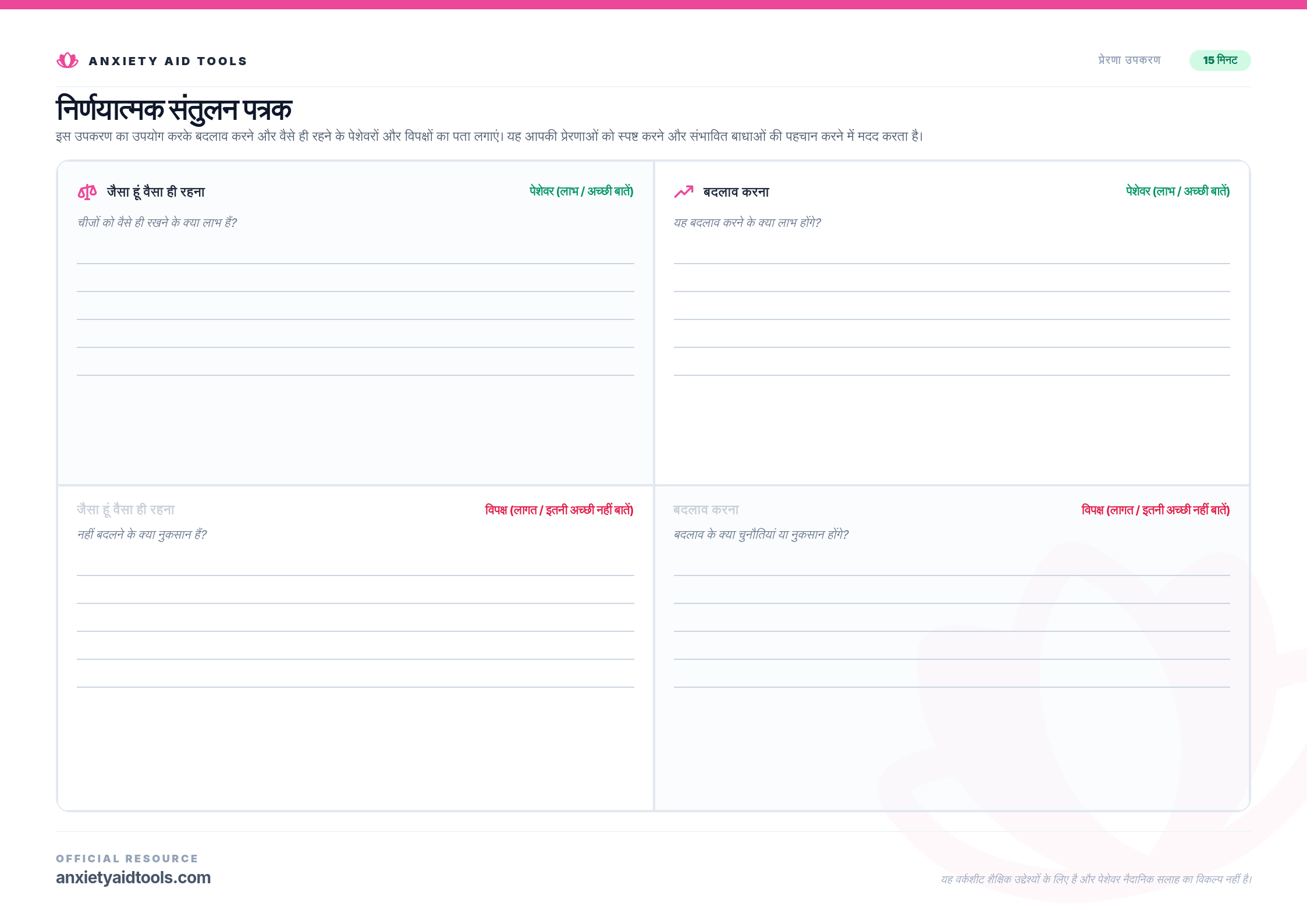 निर्णयात्मक संतुलन पत्रक मोटिवेशनल इंटरव्यूइंग (एमआई) से एक शक्तिशाली टूल है जो आपको द्वंद्वात्मकता में मार्गदर्शन करने में मदद करने के लिए डिज़ाइन किया गया है। जब भी हम कोई महत्वपूर्ण बदलाव पर विचार करते हैं—चाहे नई आदत शुरू करना, रिश्ता खत्म करना या व्यवहार बदलना हो—हम स्वाभाविक रूप से दो दिशाओं में खींच महसूस करते हैं। यह वर्कशीट आपको उस आंतरिक संघर्ष को बाहरी करने में मदद करता है।