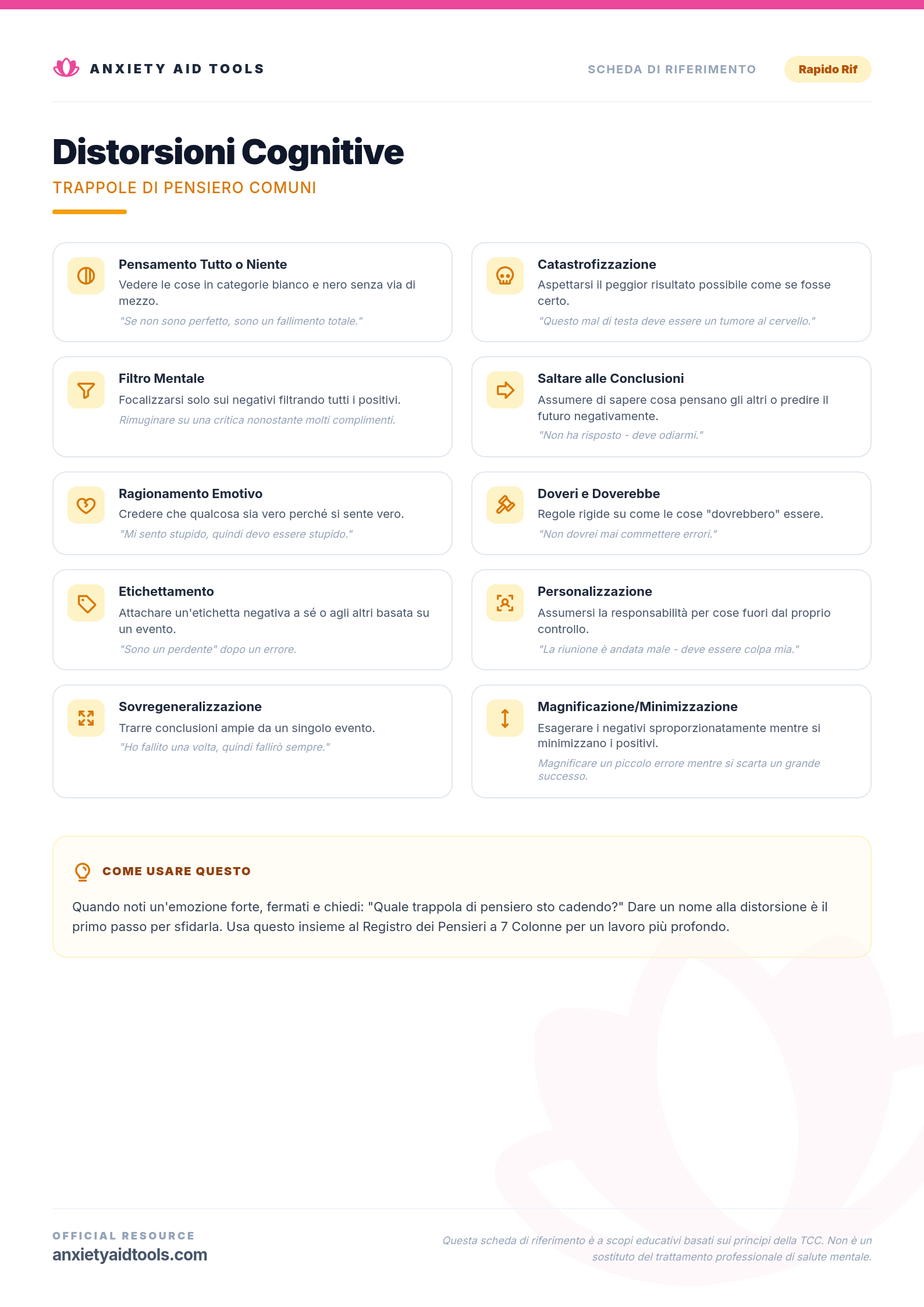 Per ottenere i migliori risultati, usa questa scheda di riferimento insieme al tuo Registro di Pensieri a 7 Colonne o altri strumenti di ristrutturazione cognitiva. Quando catturi un pensiero automatico, scansiona questa lista per vedere in quale "trappola di pensiero" cade. Nominare la distorsione specifica ti dà immediata distanza psicologica dal pensiero, rendendolo molto più facile da sfidare con prove equilibrate. La pratica costante aiuta a riscablare il tuo cervello per adottare naturalmente prospettive più flessibili e realistiche nel tempo.