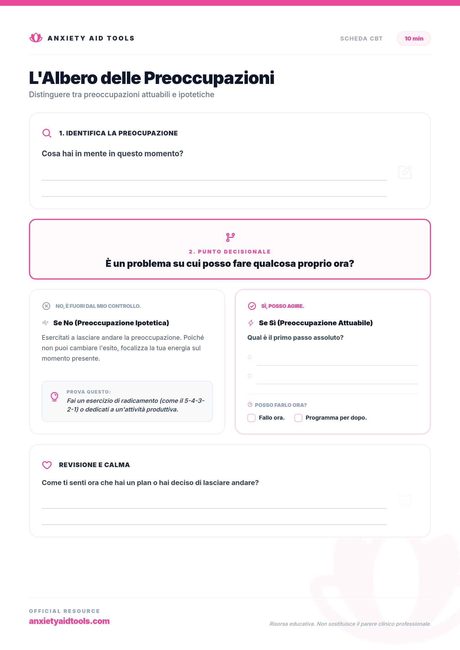 Usare l'Albero delle Preoccupazioni costantemente aiuta a riallenare il tuo cervello a dare priorità alla risoluzione efficace dei problemi rispetto alla preoccupazione 'passiva'. È particolarmente efficace per il Disturbo d'Ansia Generalizzato (GAD) e per chiunque si senta sopraffatto da una lunga lista di preoccupazioni.