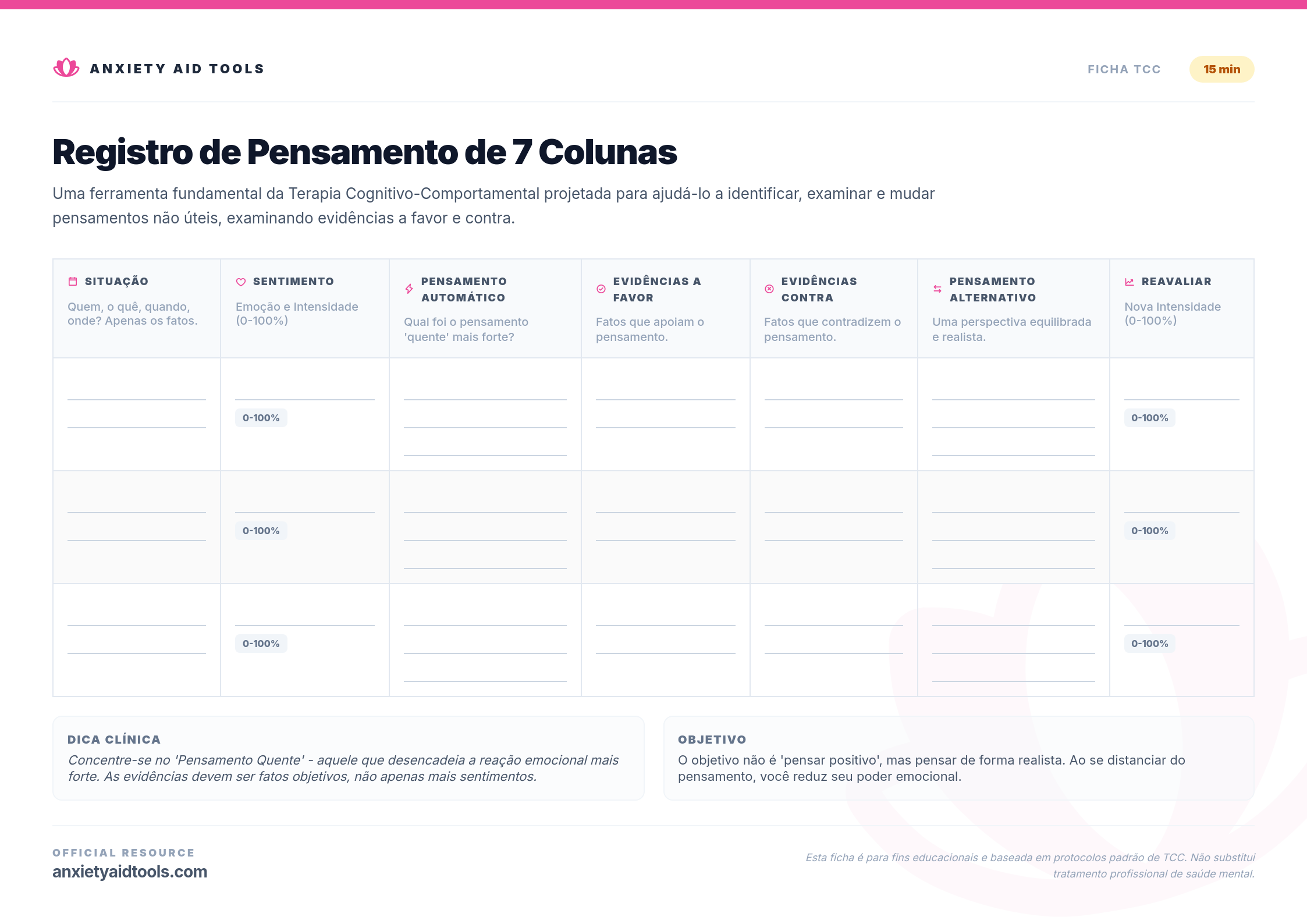 O Registro de Pensamento de 7 Colunas é o padrão-ouro da Terapia Cognitivo-Comportamental (TCC). É uma forma estruturada de avaliar os pensamentos que desencadeiam desconforto emocional. Ao desacelerar e escrever as evidências a favor e contra um pensamento, você pode passar do raciocínio emocional para a realidade objetiva.