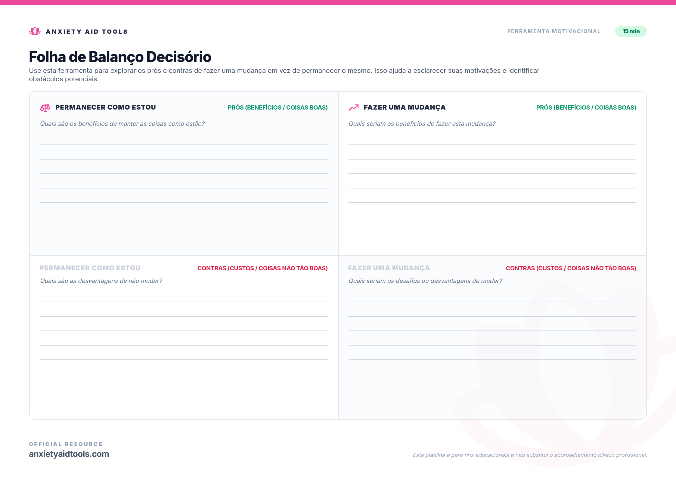 A Folha de Balanço Decisório é uma ferramenta poderosa da Entrevista Motivacional (MI) projetada para ajudá-lo a navegar ambivalência. Sempre que consideramos fazer uma mudança significativa—seja iniciar um novo hábito, terminar um relacionamento ou mudar um comportamento—naturalmente nos sentimos puxados em duas direções. Esta folha de trabalho ajuda você a externalizar esse conflito interno.