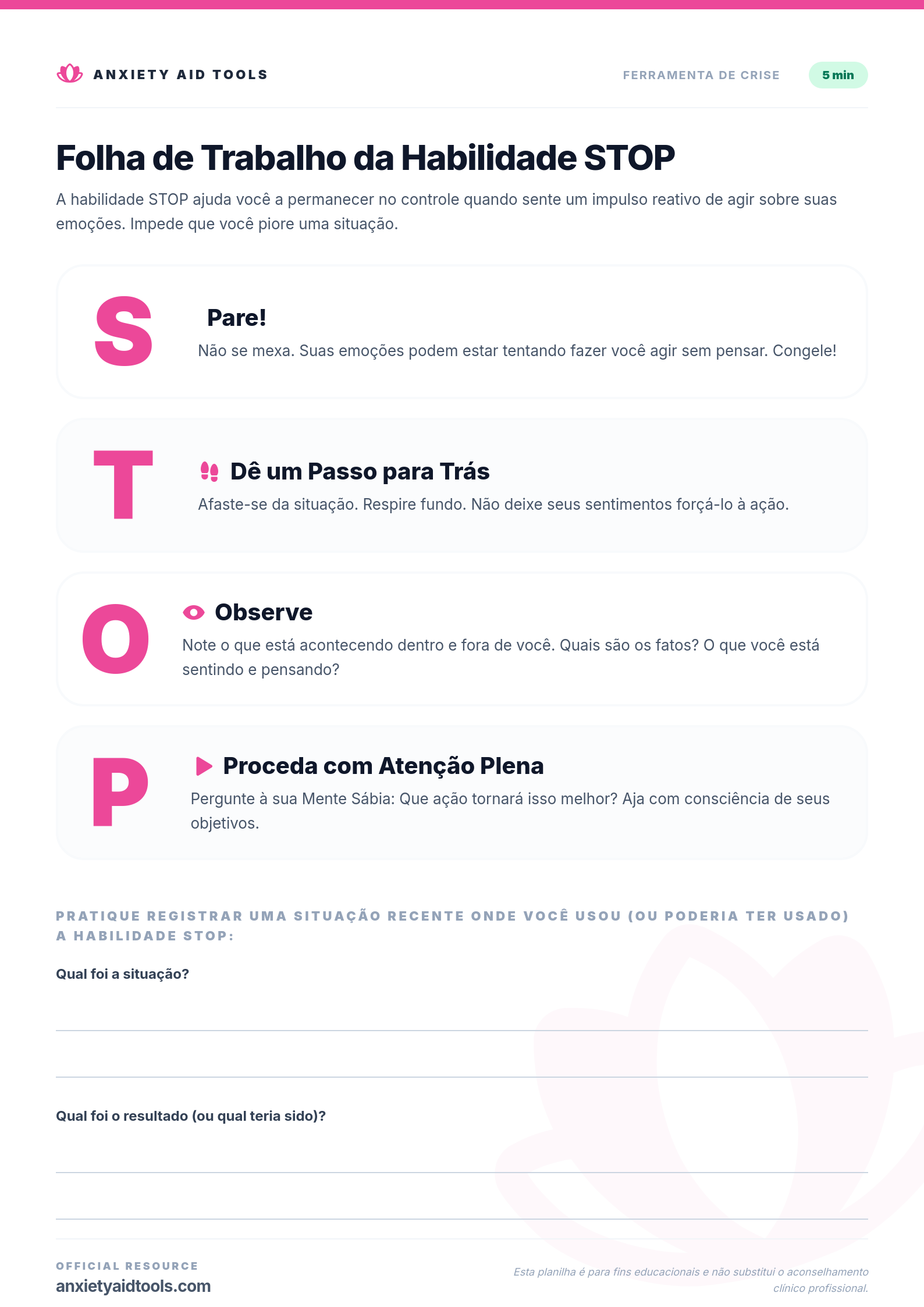 Esta folha de trabalho ajuda você a praticar a habilidade refletindo sobre situações passadas e planejando para futuras. O objetivo é mover do comportamento reativo para responsivo, garantindo que suas ações estejam alinhadas com seus objetivos de longo prazo e Mente Sábia.