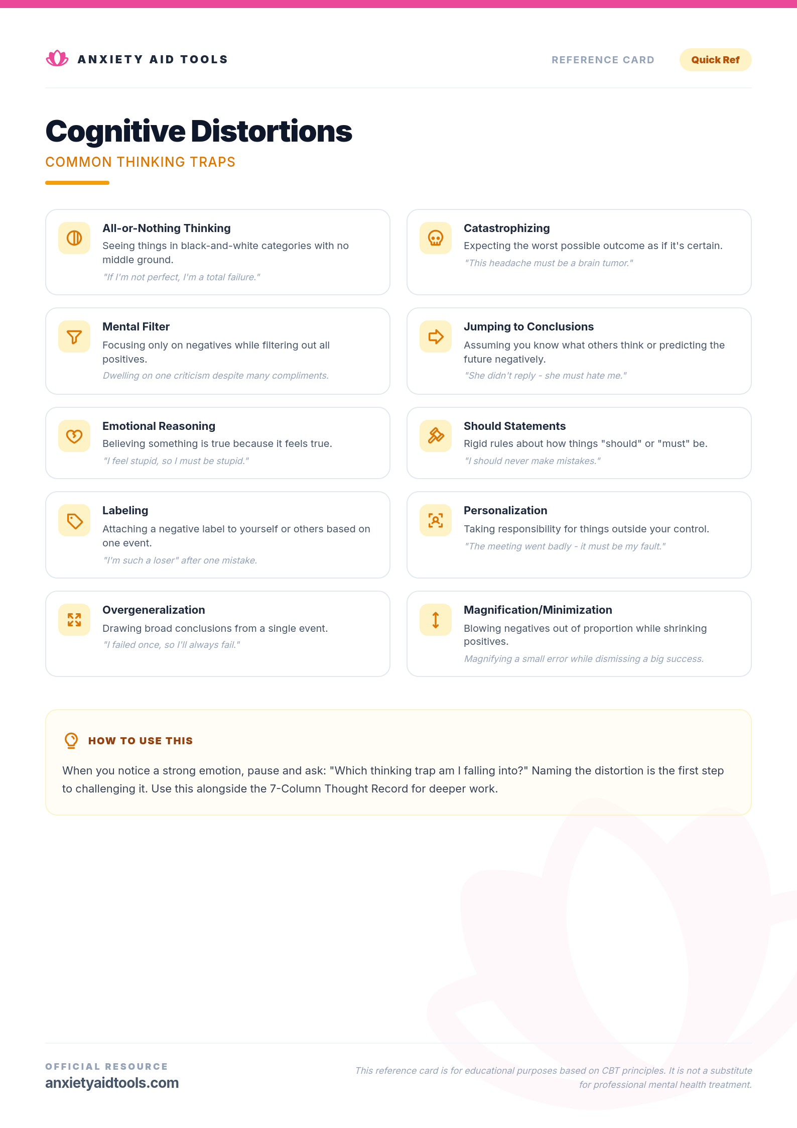 For the best results, use this reference card alongside your 7-Column Thought Record or other cognitive restructuring tools. When you catch an automatic thought, scan this list to see which "thinking trap" it falls into. By naming the specific distortion, you gain immediate psychological distance from the thought, making it much easier to challenge with balanced evidence. Consistent practice helps rewire your brain to naturally adopt more flexible and realistic perspectives over time.