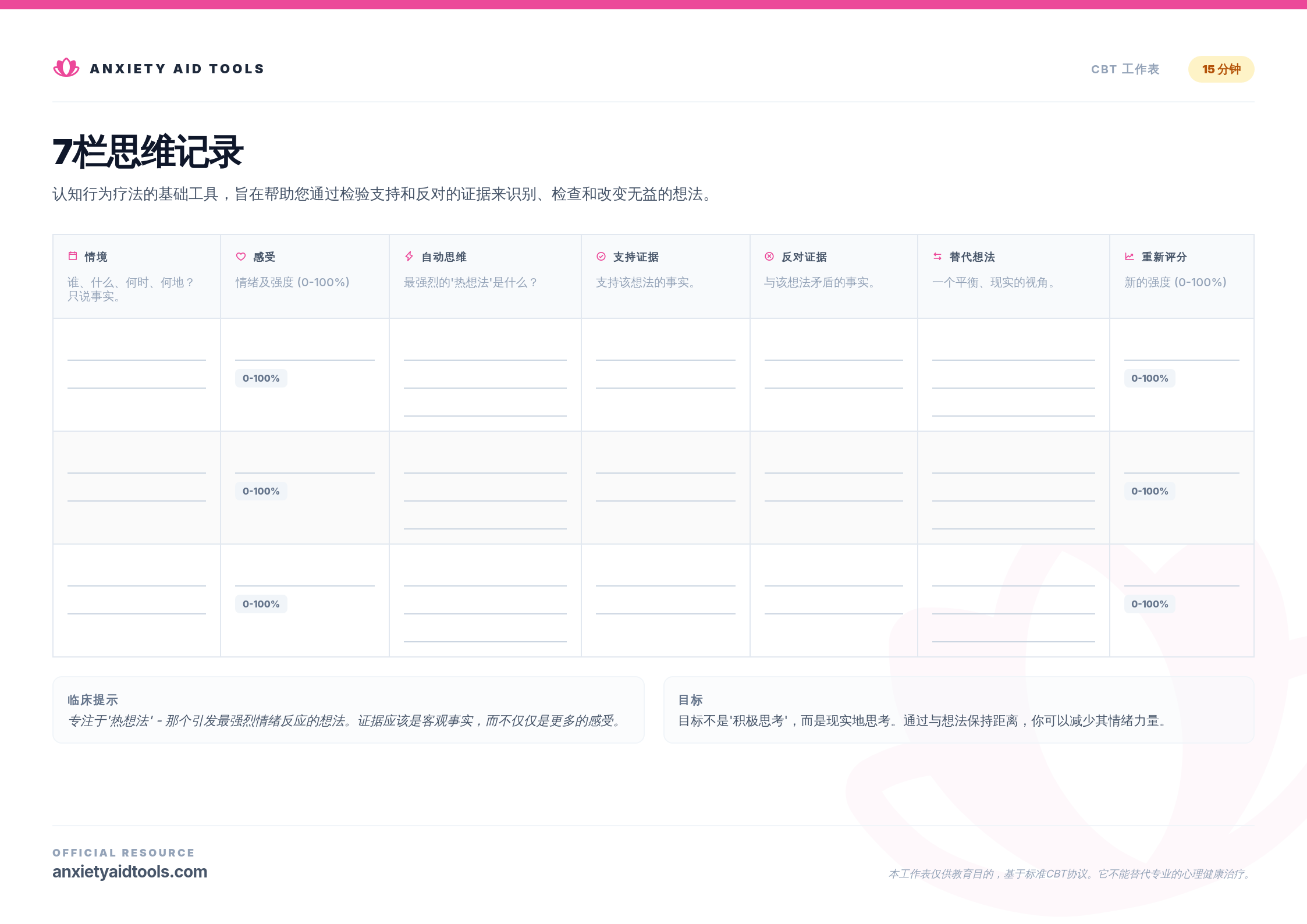 7栏思维记录是认知行为疗法(CBT)的黄金标准。这是一种结构化的方法来评估引发情绪困扰的想法。